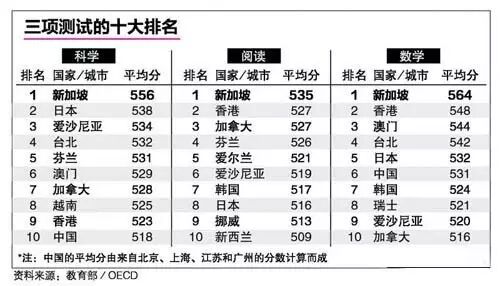 在国际教育界,评价一个国家或地区的基础教育水平有个标准,即经济合作与发展组织的国际学生评估计划(PISA)。这项计划对全世界15岁学生的学习水平进行测试,每三年举行一次。新加坡在这项测试中一直名列前茅。2015年更是拿下科学、数学、阅读三项第一。