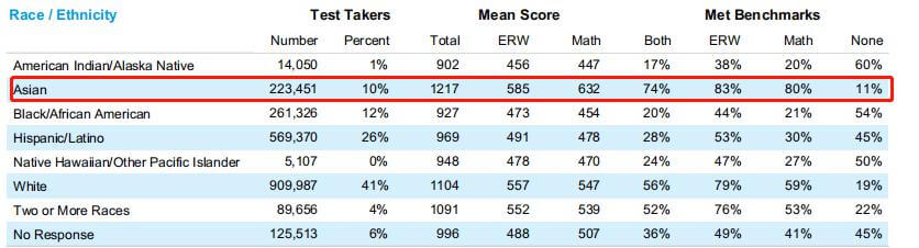 数据中可看出亚裔考生以1217分的平均分领先全球,和第二名的白人考生相比高出了113分,果然我们的应对考试的能力还是很高的。