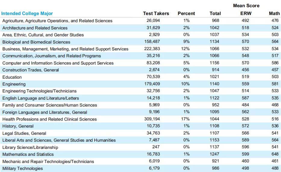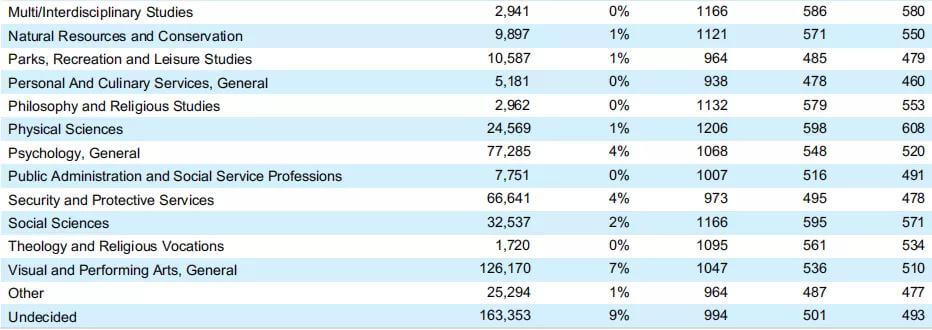 分数最高的两个专业分别为数学和统计学,平均分为1247分,物理学为1206分。