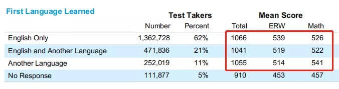 考生母语分布的角度,英语为母语的考生SAT均分最高,为1066分;其次是母语为非英语的考生,均分1055;而母语同时为英语和其他语言的考生均分则只有1041。