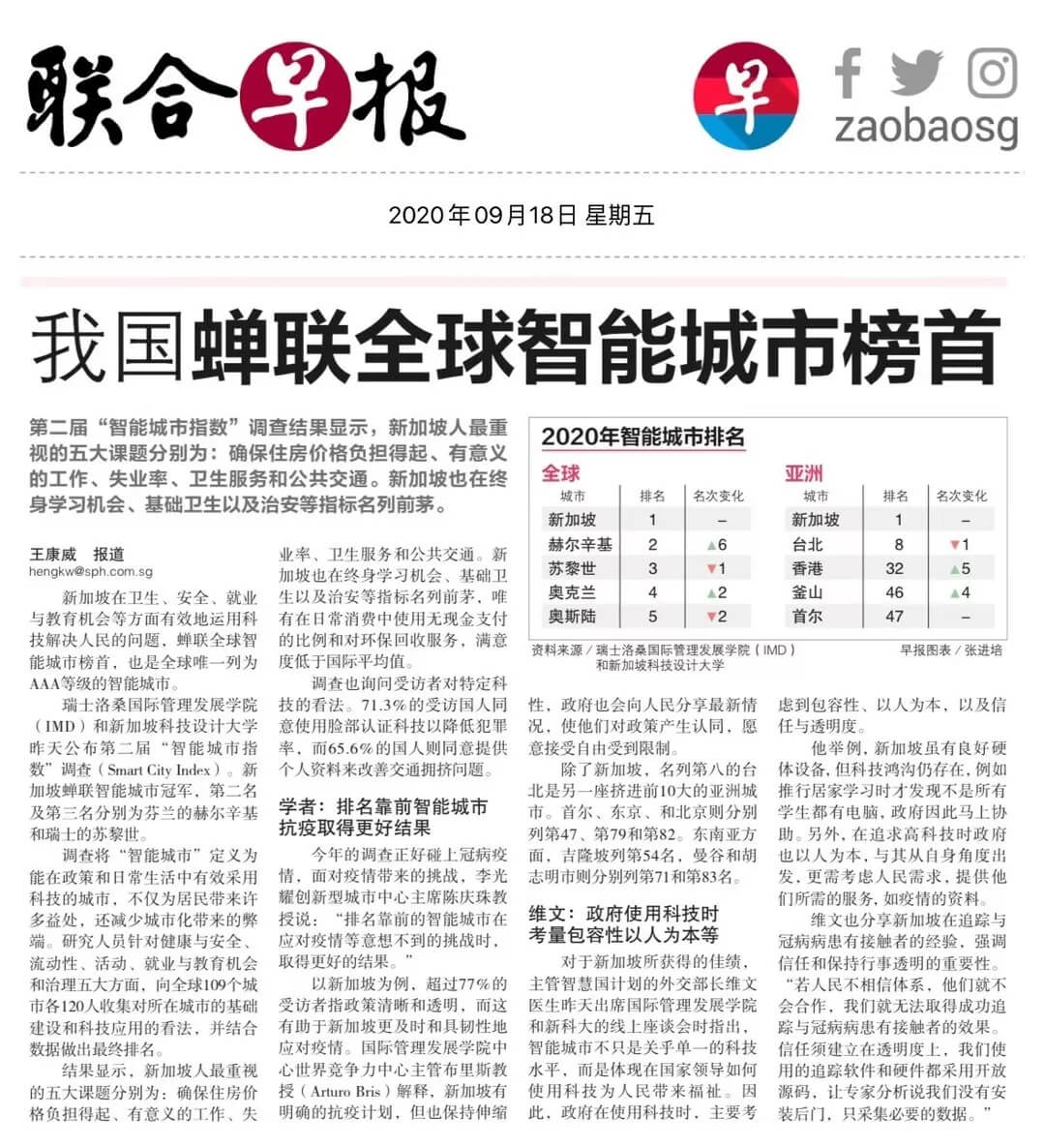 瑞士洛桑国际管理发展学院(IMD)和新加坡科技设计大学昨日公布第二届“智能城市指数”调查(Smart City Index),新加坡蝉联智能城市冠军,第二名及第三名则分别为芬兰的赫尔辛基和瑞士的苏黎世。